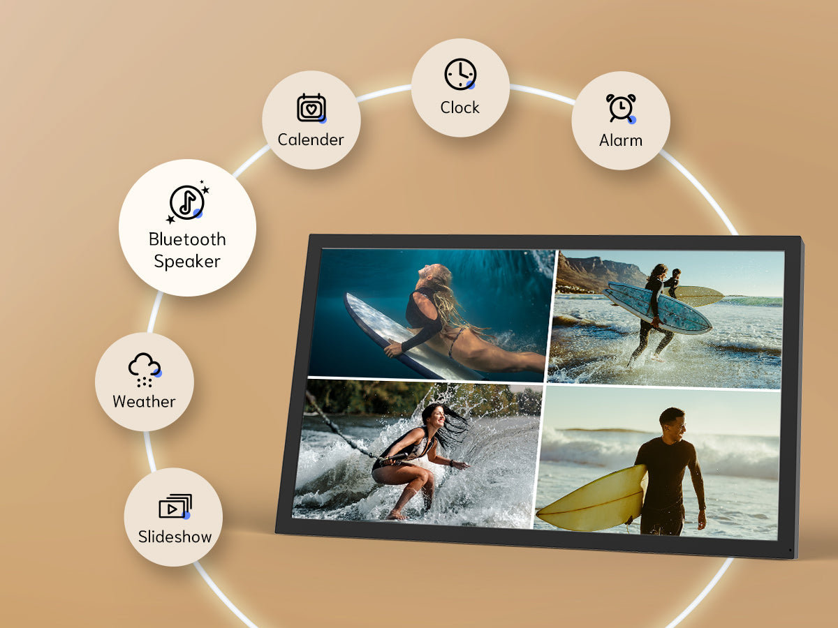 • All-in-One Art Frame: The built in light sensor that automatically adjusts display brightness based on ambient lighting conditions, optimizing your experience day or night. There are more useful functions available in this smart digital photo frame, including weather, calendar, clock and alarm.