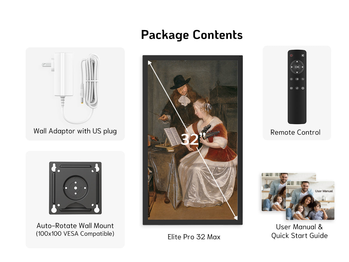 • Elite Pro FHD Display with 64 GB Memory & 64GB USB Drive: The NexFoto 32-inch digital art frame features 1920 x 1080 FHD Matte Screen (aspect ratio 16:9) that showcases your memories in vibrant colors and sharp details, while the IPS display technology brings much wider viewing angles. The user-friendly interface and remote control make navigation simple. With 64 GB internal memory, this digital picture frame can store up to 160,000 pictures. Besides, the package comes with a 64GB USB dirve. And if needed, you also can use a micro SD card to expand the storage space.
