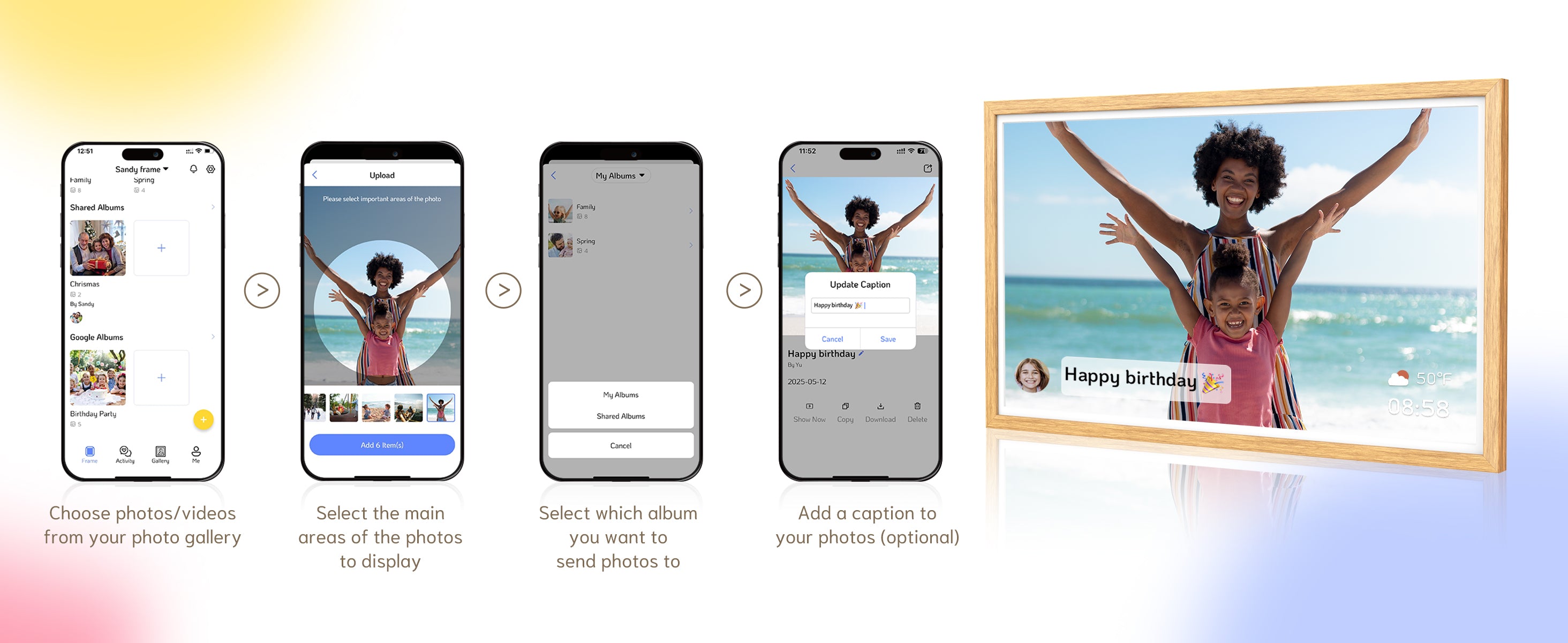 Instantly upload photos and videos from anywhere, anytime.Enjoy the convenience of cloud storage, create an absolutely private and safe space for you, share memories with your family and friends, and interact and like. A timeless wooden look that adds natural warmth and texture to your space, extra large digital photo frame can auto-rotating screen beautifully presents your memories .This digital photo frame can be as a perfect gift for any special events,represents your love and care.
