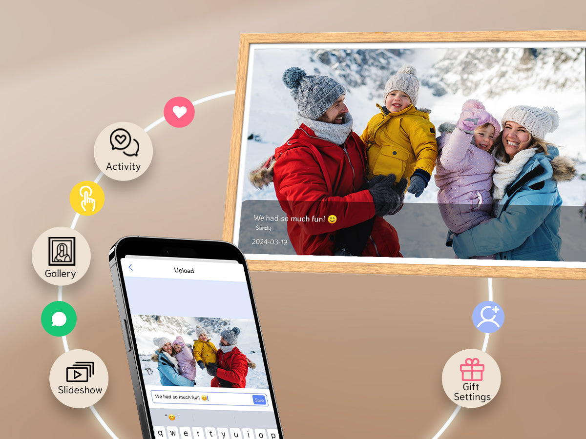 Connect via Bluetooth and WiFi to use your phone as a remote. Select, show and favorite photos & videos from your couch. Elderly gift recipients can enjoy it more with family's remote assistance.