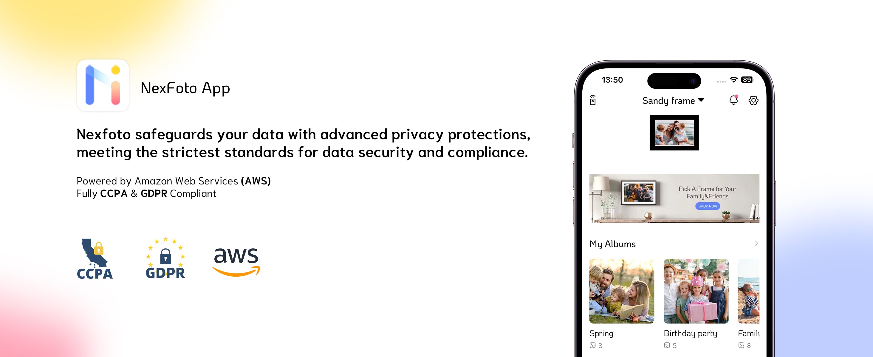 I did my homework before buying a cloud-connected frame. Knowing the photos are encrypted on AWS made me choose this one.Does exactly what it promises.