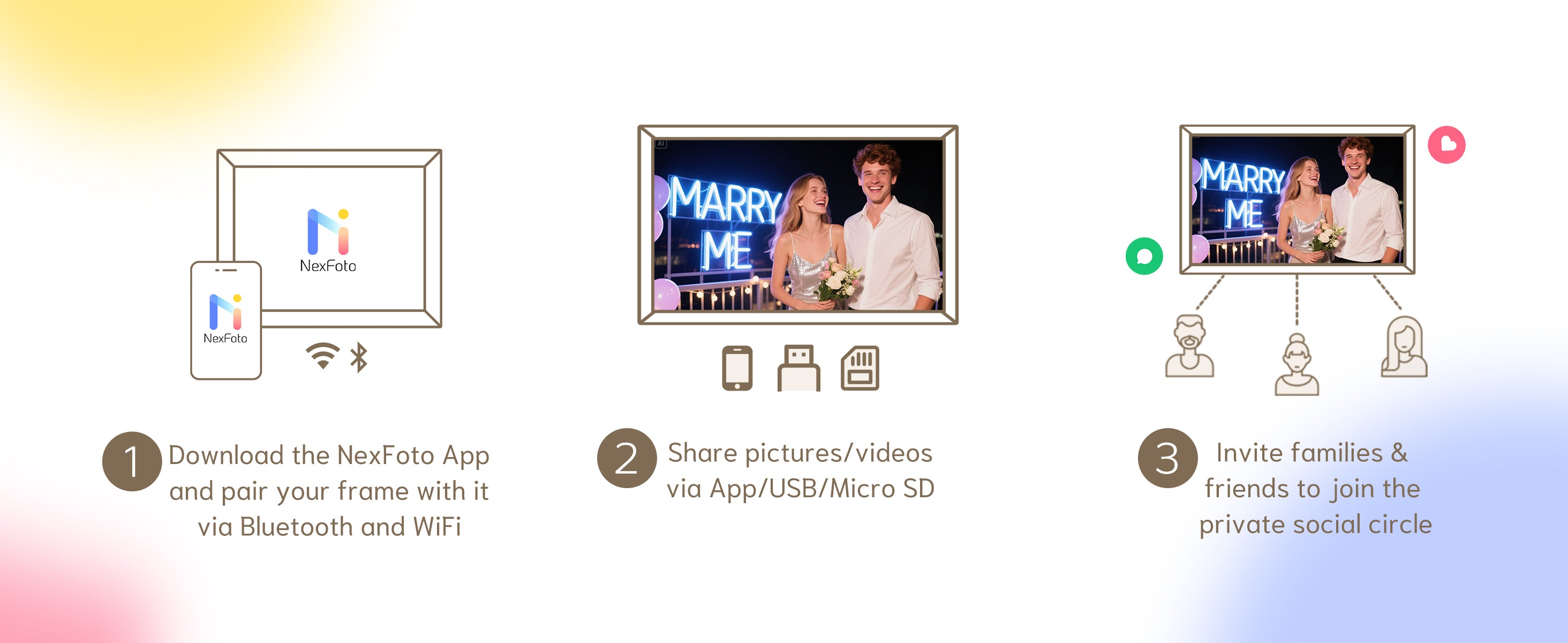NexFoto digital frame is compatible with 2.4GHz and 5GHz, with faster transmission and higher efficiency.