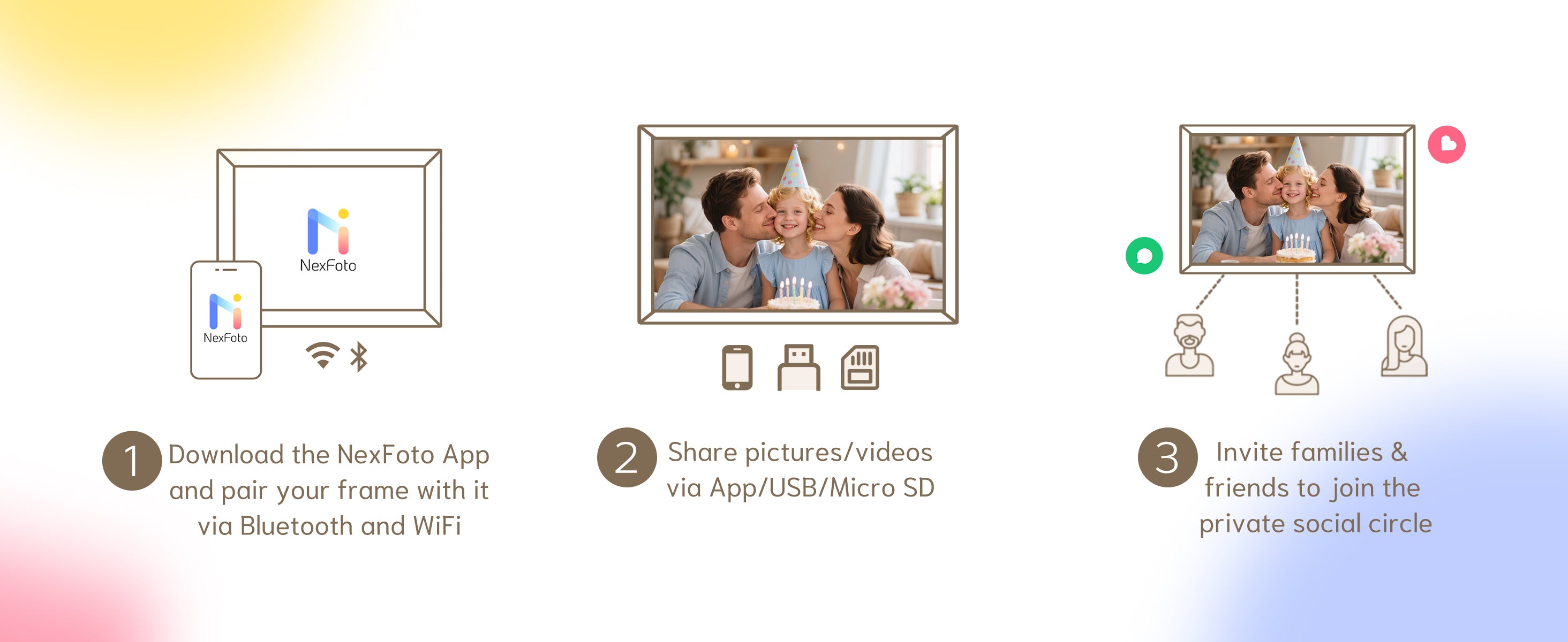 NexFoto digital frame is compatible with 2.4GHz and 5GHz, with faster transmission and higher efficiency.
