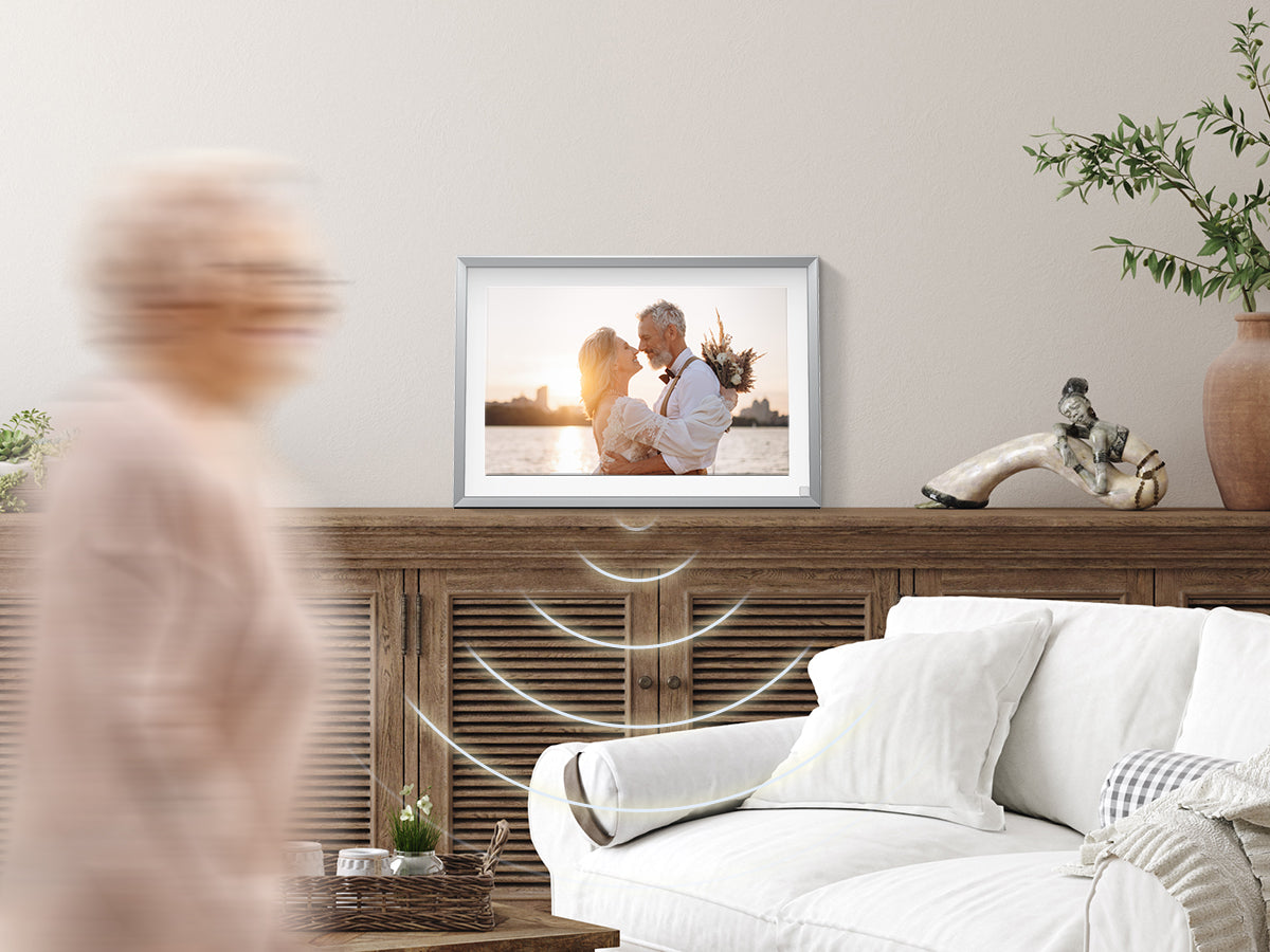 Smart motion tech reduces power use: Automatically turn off the frame when no one is around, and turn on when someone nearby is sensed. The frame can also be set to turn on/off at specified times.