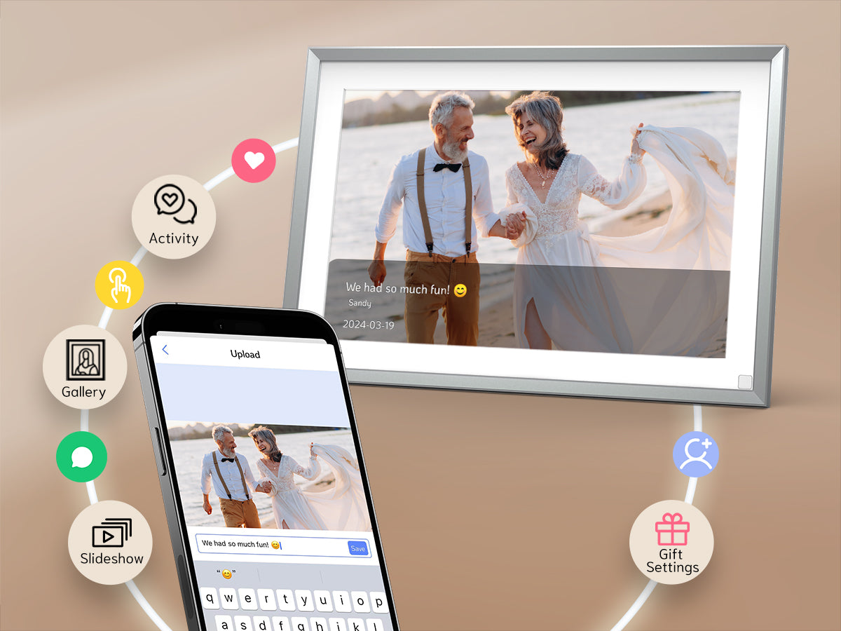Instantly upload photos and videos from anywhere, anytime.Enjoy the convenience of cloud storage, create an absolutely private and safe space for you, share memories with your family and friends, and interact and like. The minimalist modern design enhances your home decor. This digital photo frame can be as a perfect gift for any special events,represents your love and care.