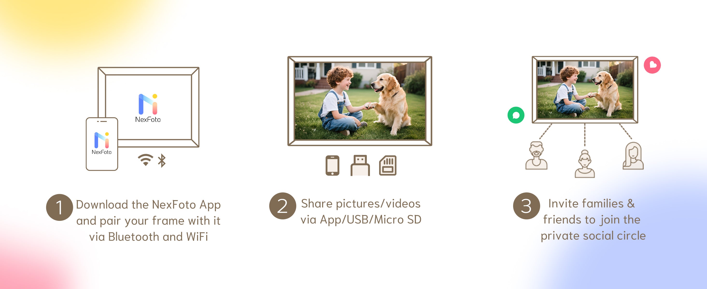 Download the Nexfoto app to set up your digital frame and explore its latest features. Our brand-new software makes our all-in-one frame incredibly user-friendly and innovative.
