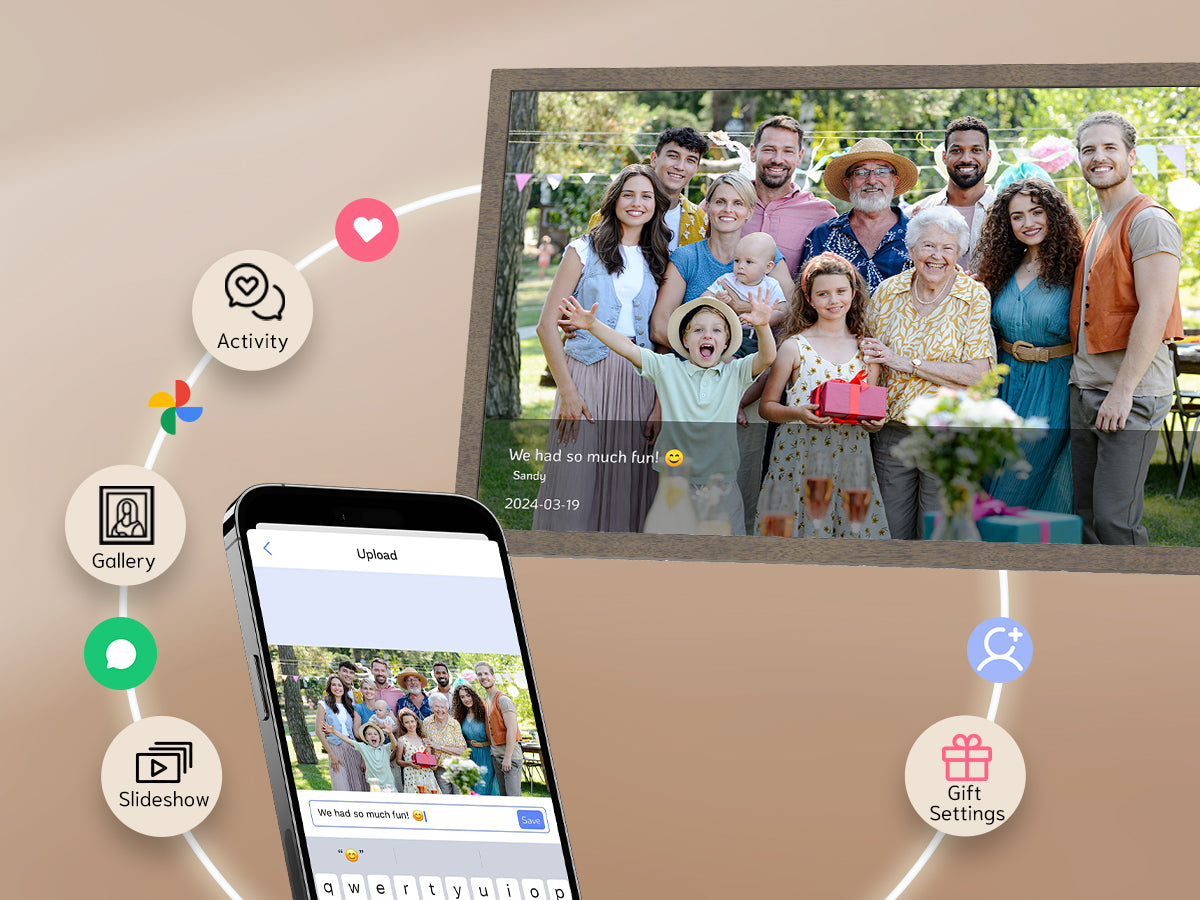 Connect via Bluetooth and WiFi to use your phone as a remote. Select, show and favorite photos & videos from your couch. Elderly gift recipients can enjoy it more with family's remote assistance.