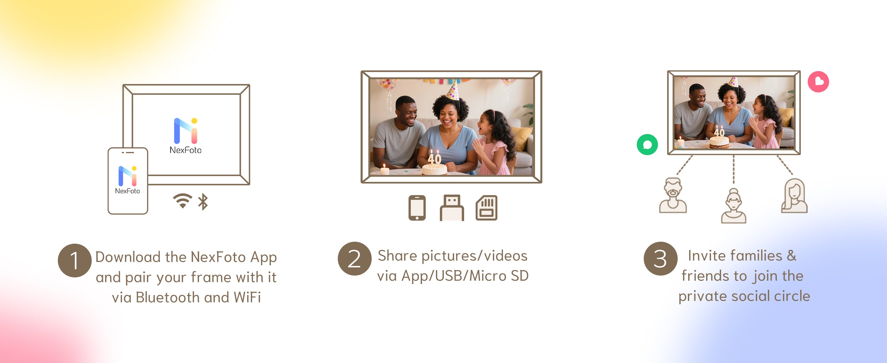 NexFoto digital frame is compatible with 2.4GHz and 5GHz, with faster transmission and higher efficiency.