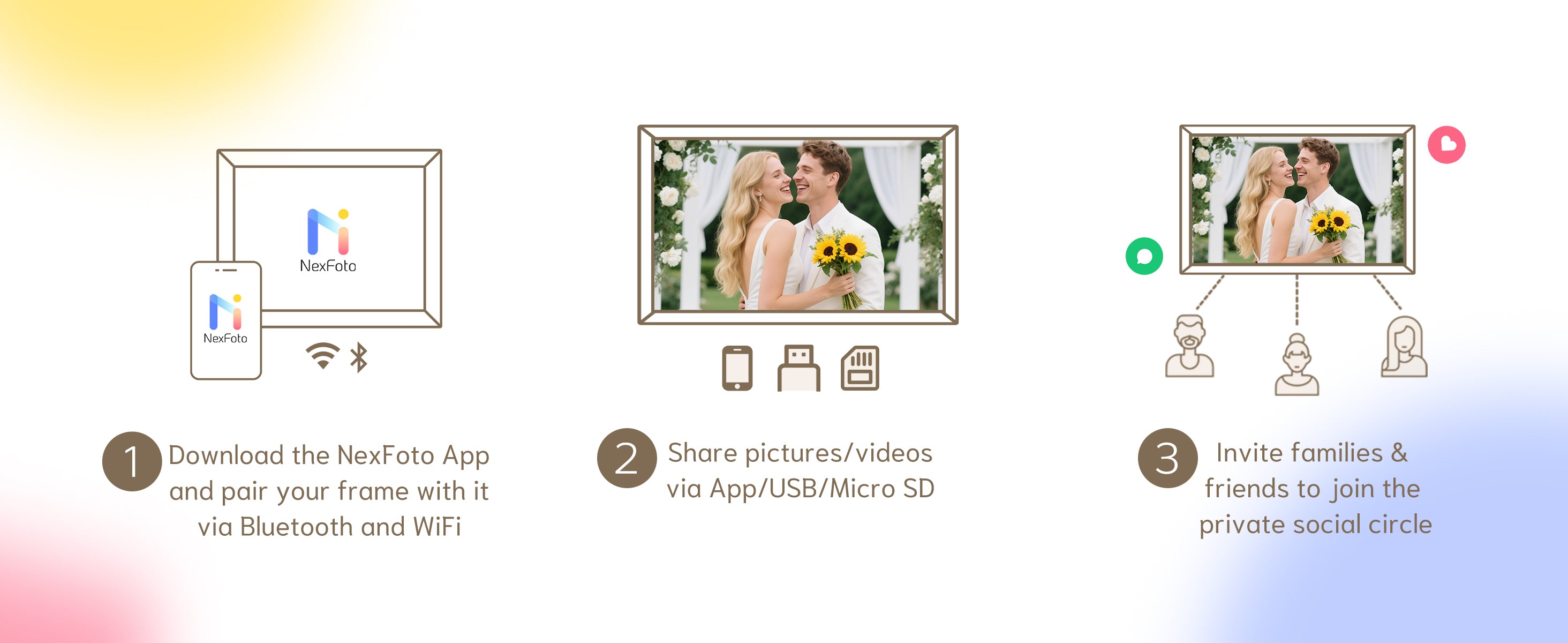 NexFoto digital frame is compatible with 2.4GHz and 5GHz, with faster transmission and higher efficiency.