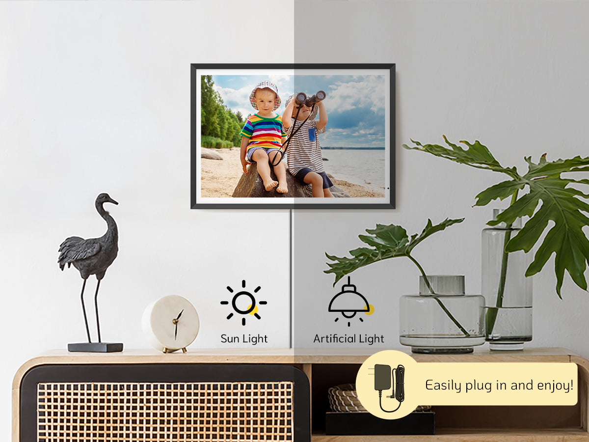 This digital art frame is equipped with a light sensor that automatically adjusts display brightness based on ambient lighting conditions, optimizing your experience day or night.