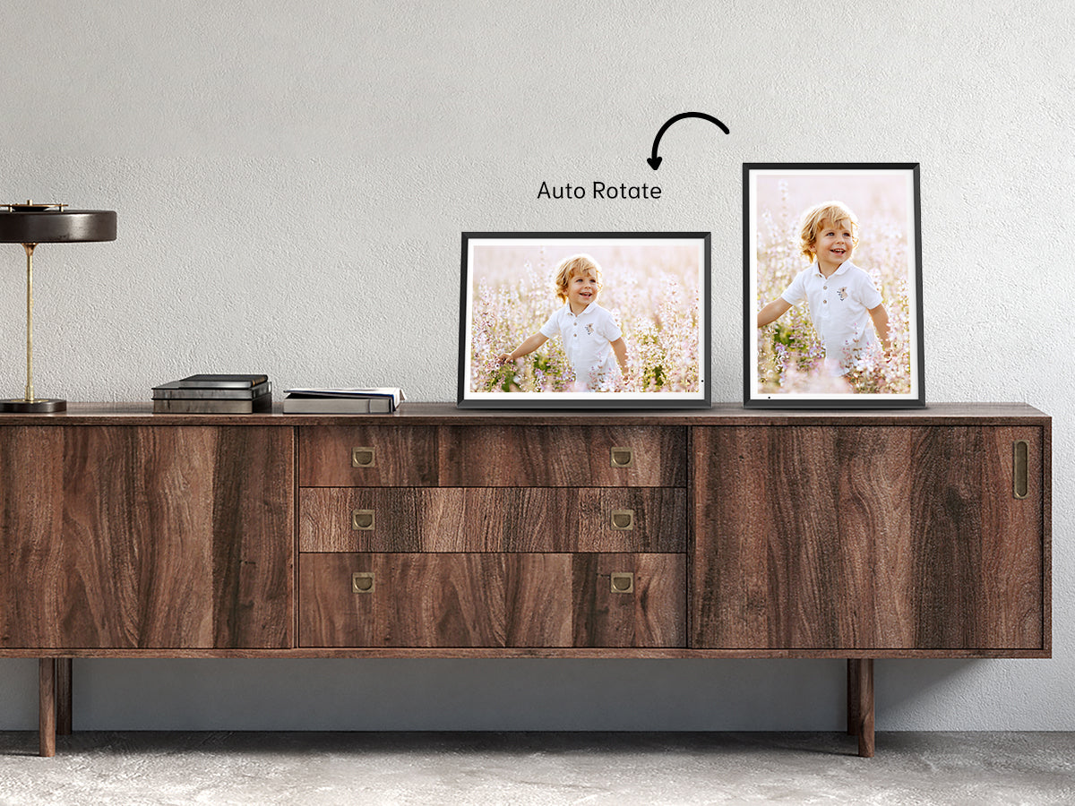 Our frame can be placed on the table in landscape or portrait or you may also hang it on the wall. The images will automatically rotate according to the orientation for the best fit.